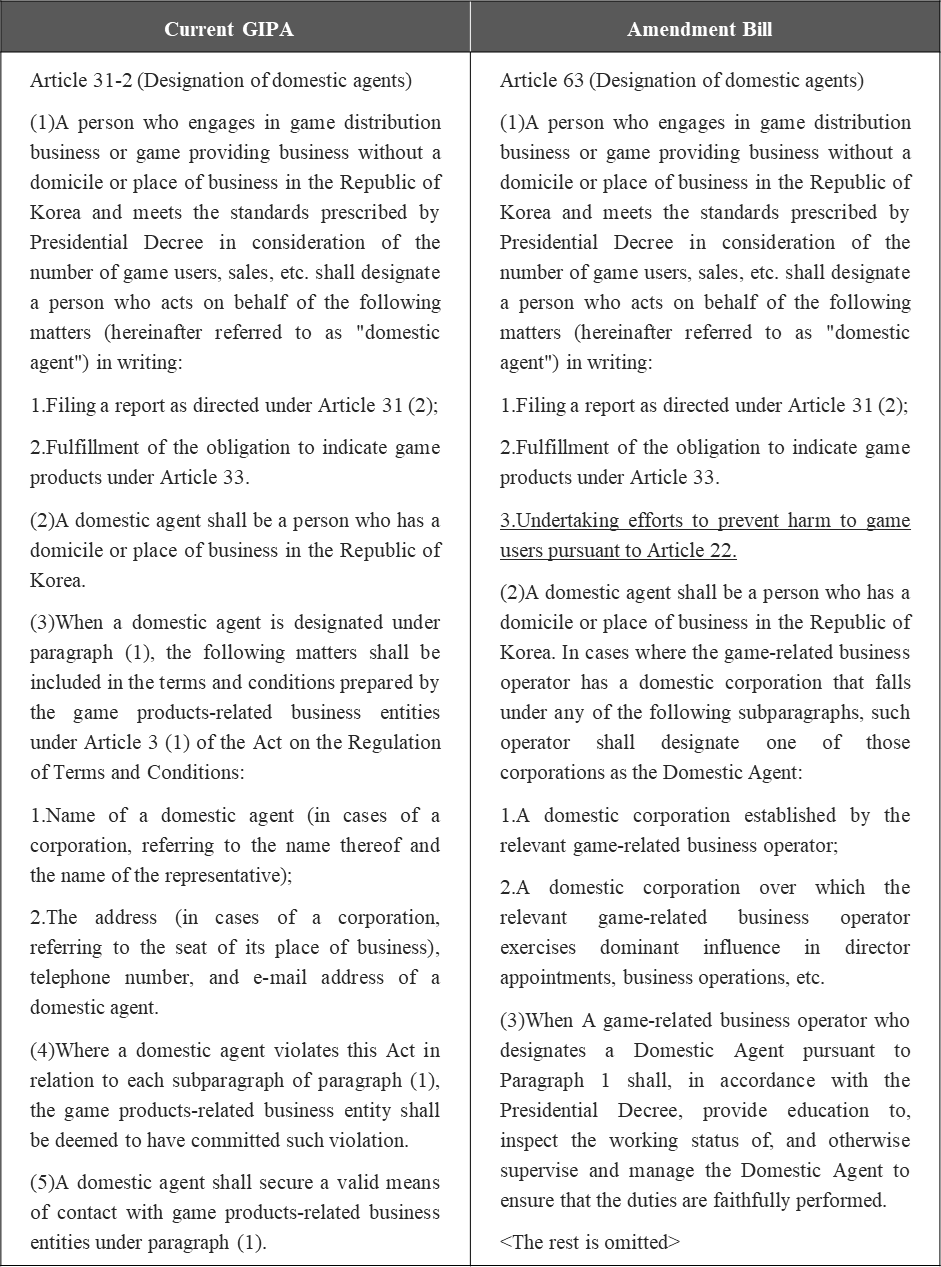 Effective October 23, 2024, the obligation for overseas game companies to appoint a domestic agent will mirror domestic agent systems under the Personal Information Protection Act, the Telecommunications Business Act, and the Act on Promotion of Information and Communications Network Utilization and Protection of Information. These systems have matured over years of practical implementation, and the new amendment incorporates many of the best practices developed elsewhere. Examples include requiring a foreign game operator with a domestic corporation to appoint that entity as agent (Amendment Art. 63(2)), and imposing management/supervision obligations over the agent’s activities (Art. 63(3)).
