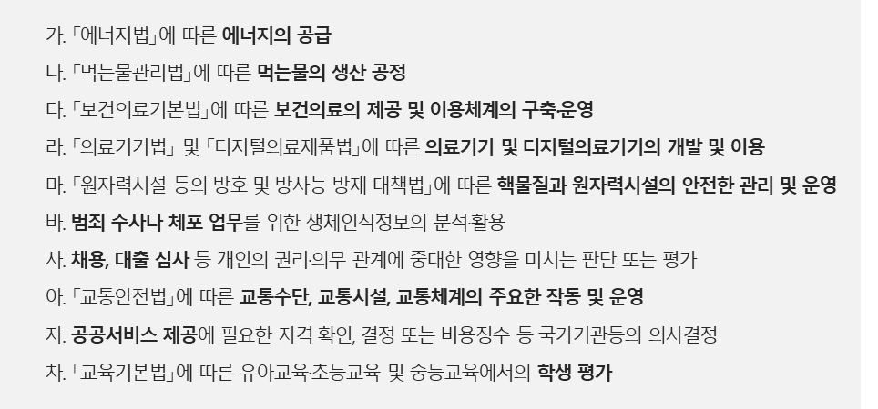 가이드라인은 각 영역별로 고영향 AI를 판단하는 주요 기준과 사례를 공개하고 있습니다. 다음은 가이드라인 내용의 핵심을 요약하여 정리한 표입니다.