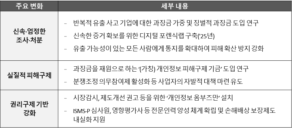 개인정보보호위원회가 발표한 강화 방안은 국민 신뢰를 받는 개인정보 안전관리 체계 조성이라는 목표로 대규모 개인정보 처리가 수반되는 전 분야에 사전 예방중심의 점검을 강화하고 개인정보 보호가’ 전략적 투자 및 기본적 책무’라는 사회적 인식 전환을 목표로 100만 명 이상 대규모 개인정보를 처리하는 공공기관 및 민간 사업자를 대상으로 ① 선제적 제도 개선, ② 상시적 내부통제 강화, ③ 엄정한 처분 및 권리구제 실질화라는 세 가지 방향으로 정리됩니다.