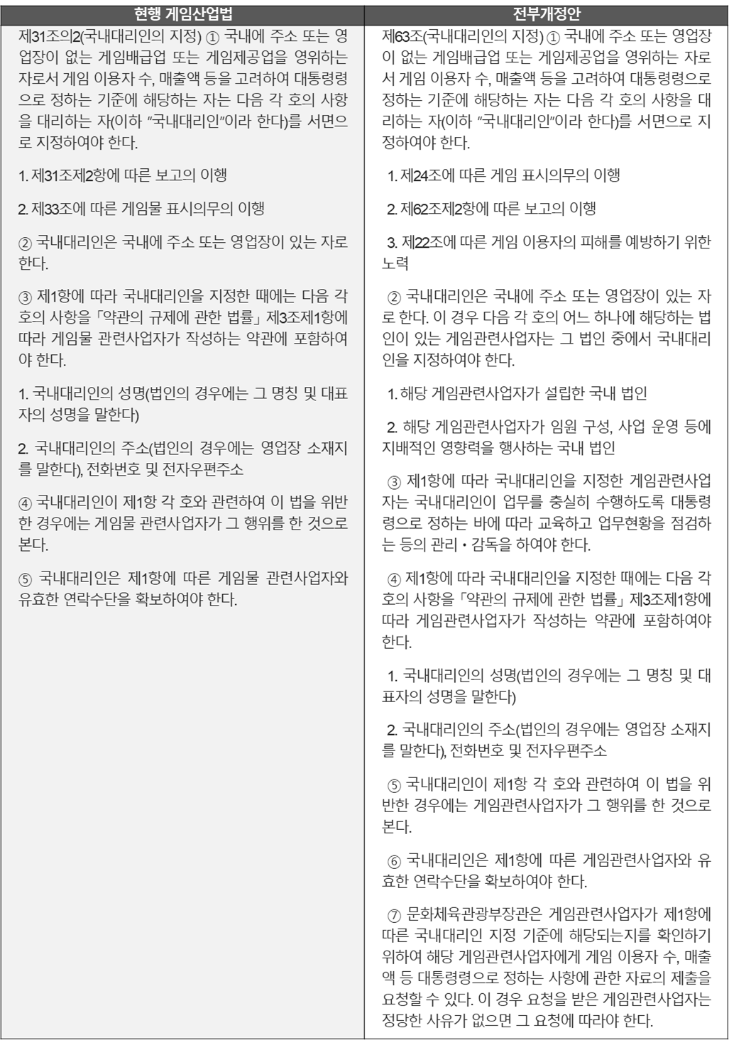 연말 전부개정안의 국회 통과와 정부 공포 이후, 2027년 초 시행 시점이 되면, 향후 또 다른 법률에서 보여주는 국내대리인 제도 강화 추세까지 시너지를 내면서 게임산업법상 국내대리인 역시 ‘피해 구제 업무’까지 담당하도록 더욱 구체화될 가능성이 높다고 글로벌 게임사들은 전망할 필요가 있습니다.