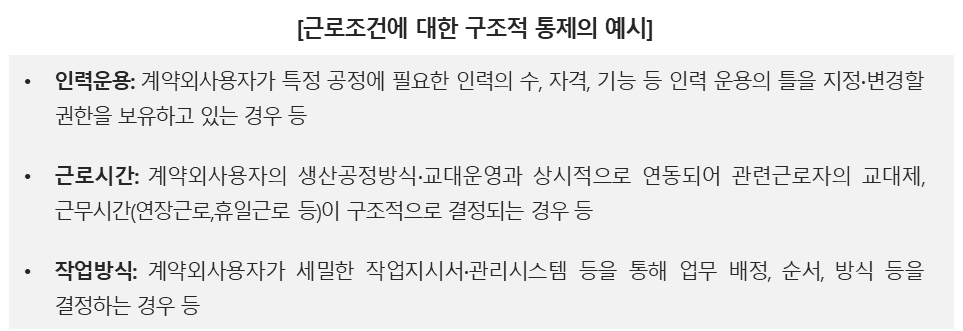 해석지침(안)에 따르면, 계약사용자와 계약외사용자의 업무가 단계별로 밀접하게 연계되어 있거나 작업 공정이 상호의존적인 경우(예. 생산라인 연동)에 구조적 통제가 인정될 가능성이 높습니다. 반면 납품형 외주하청 등 도급인의 사업장 밖에서 수급인이 독립된 설비를 갖추고 완제품이나 부품을 생산하여 납품하는 통상적인 물량도급 관계의 경우 구조적 통제가 인정되지 않을 가능성이 높습니다.