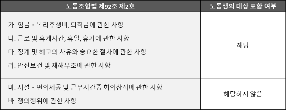 A16. 개정 노동조합법 시행 전 법원은 ‘정리해고 실시 여부’를 고도의 경영상의 결단으로 보아 쟁의행위의 정당한 목적이 될 수 없다고 판단하였습니다. 이에 대해 고용노동부는 위 해석지침(안)에서 “개정 노동조합법에 따르면 정리해고는 근로조건의 본질적인 요소인 근로자의 지위 박탈 등 근로조건에 중대한 영향을 미치는 결정에 해당하므로, 단체교섭의 대상이 된다”는 의견을 제시하면서 이와 상반되는 기존 고용노동부의 행정해석을 개정 노동조합법 시행일인 2026. 3. 10.자로 변경하겠다는 입장을 밝혔습니다. 다만, 개정 노동조합법 시행 이후에 법원이 쟁의행위의 목적에 관한 기존 판례를 변경할지 여부는 지켜보아야 합니다.