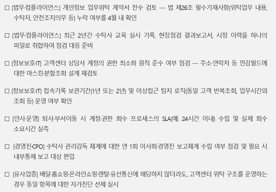 이번 점검은 5개 분야로 명시되었으나, 고객센터를 통한 개인정보 처리 구조는 해당 업종에 국한되지 않습니다. 유사한 리스크 구조를 가진 산업군에서도 향후 점검 범위가 확장될 가능성이 있으며, 선제적 자가진단이 필요합니다.