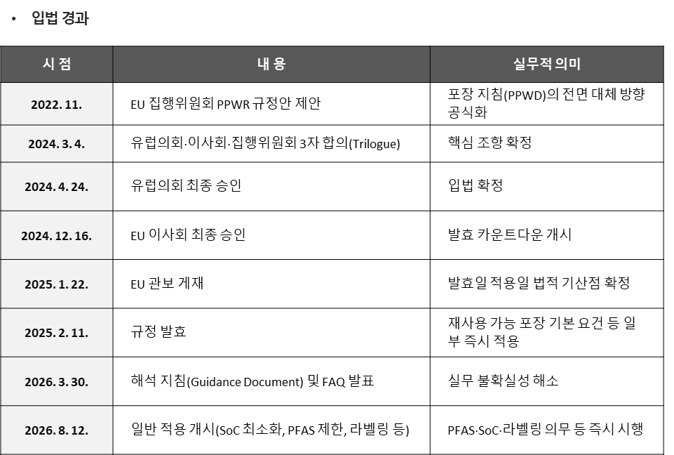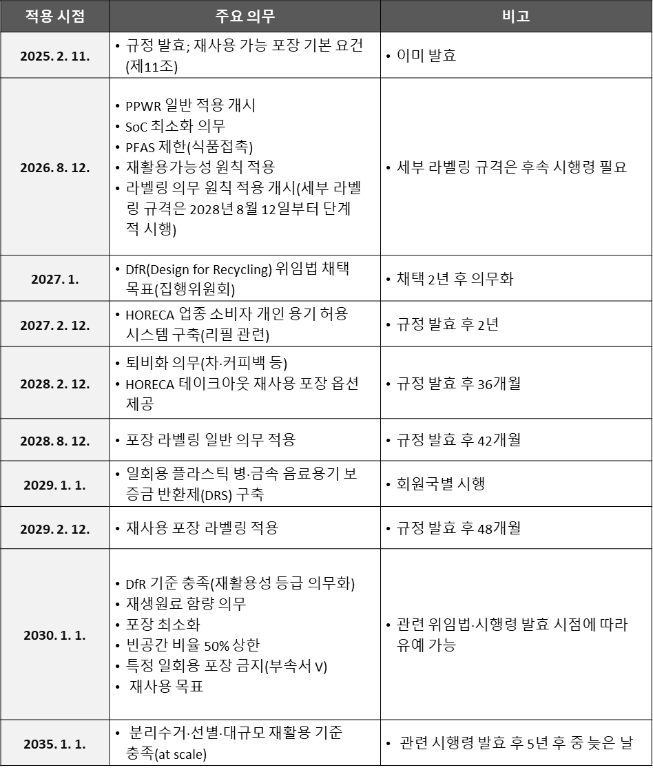 PPWR은 2025년 2월 11일 발효되었으며, 2026년 8월 12일부터 일반 적용이 개시될 예정입니다.