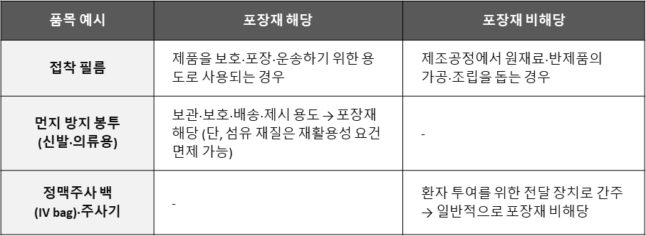 특정 품목이 포장에 해당하는지 여부는 PPWR 제3조 제1항 제1호의 포장 정의에 따라 개별적으로 판단해야 합니다. 부속서 I의 예시는 참고자료에 불과하며, 해당 품목이 실제로 제품의 보관·보호·취급·배송·제시 기능을 수행하는지 여부가 핵심 판단 기준입니다.