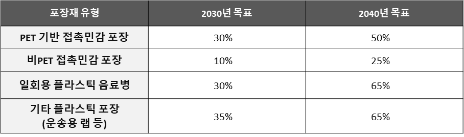 재생원료 함량 의무는 2030년 1월 1일 또는 관련 시행령 발효 후 3년 후 중 더 늦은 시점부터 플라스틱 포장재 유형별로 적용됩니다.