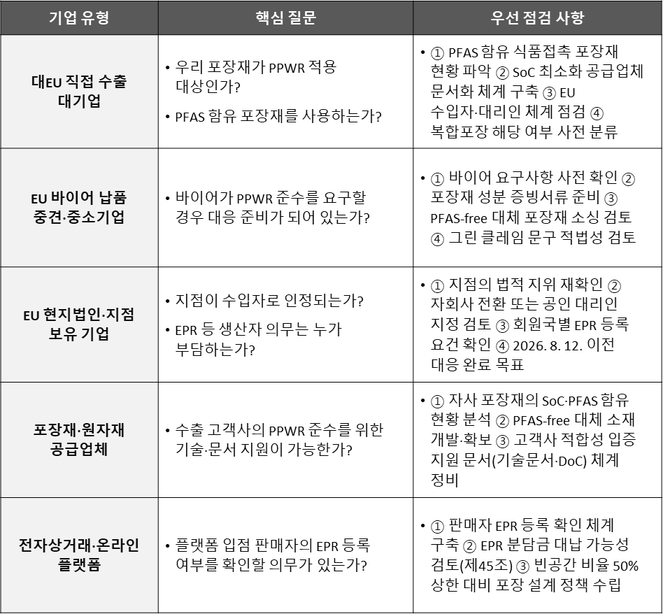 PPWR의 적용 범위와 의무 내용은 기업의 EU 진출 형태와 사업 구조에 따라 실무적 영향이 크게 달라집니다. 아래는 기업 유형별로 가장 먼저 확인해야 할 핵심 질문과 우선 점검 사항을 정리한 것입니다.