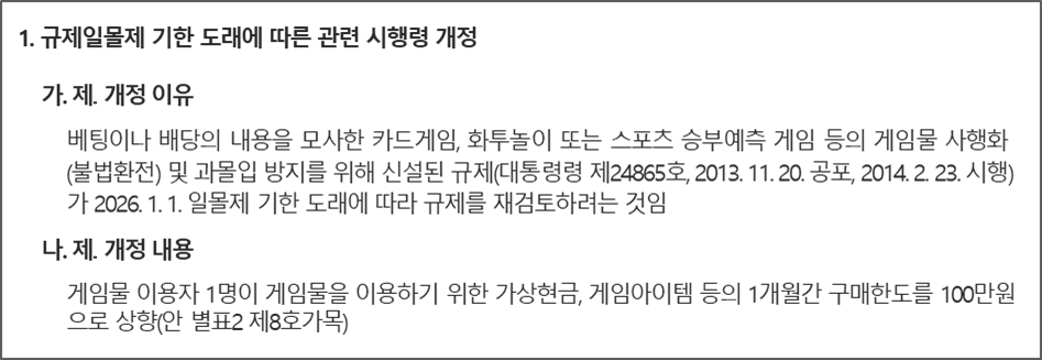 문화체육관광부는 2025년 11월 20일 게임산업법 시행령 개정안을 입법예고하였습니다. 2026년 1월 1일 도래하는 규제일몰제 기한을 앞두고 진행된 정부의 일몰심사 결과를 반영한 것으로서, 웹보드게임의 월간 결제한도를 기존 70만원에서 100만원으로 상향 조정하는 것을 핵심 내용으로 하고 있습니다.