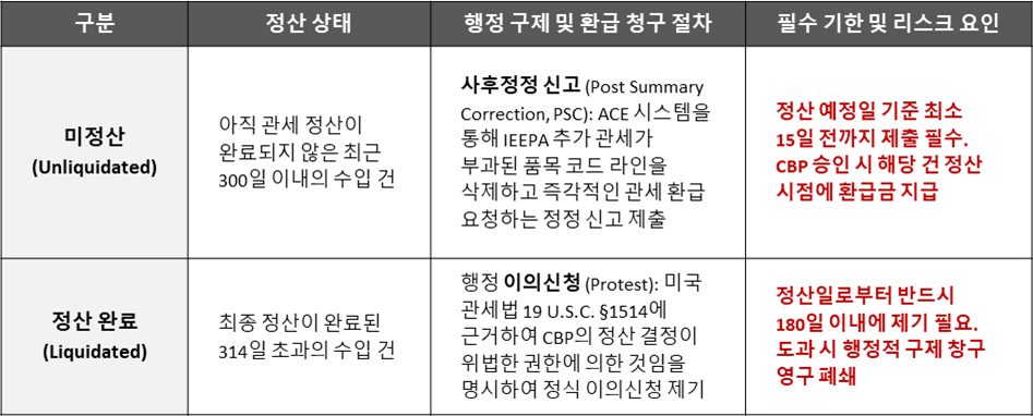 CBP 행정 절차를 통한 환급 청구는 해당 수입 건이 세관 시스템(ACE) 내에서 '정산(Liquidation)'되었는지 여부에 따라 대응 경로가 완전히 분리됩니다.