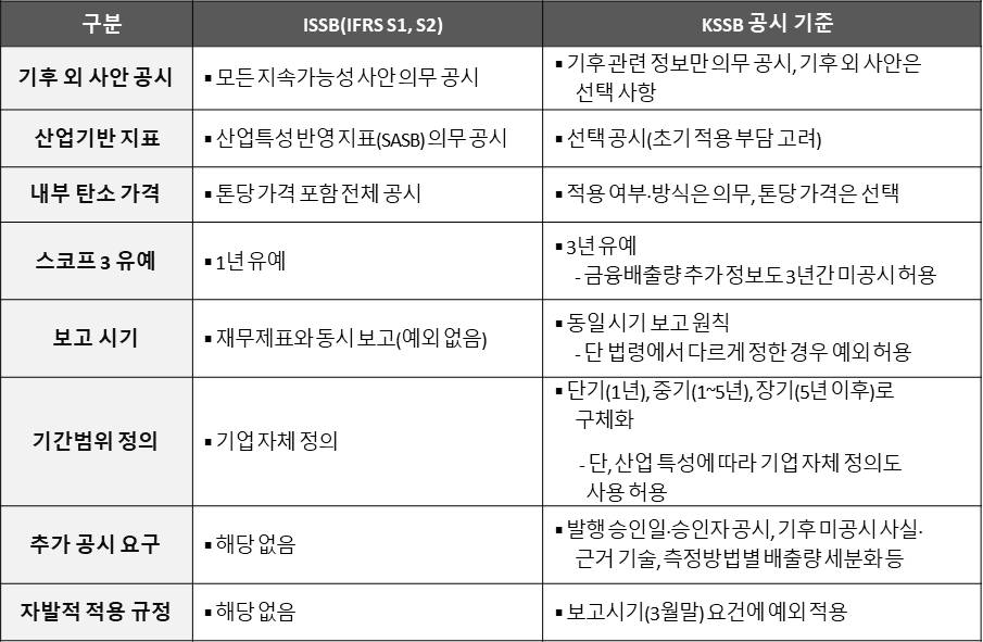 IFRS의 ISSB 기준을 기반으로 제정하되, 국제적으로 기준이 확립된 기후공시부터 먼저 의무화하고, 기후 외 다른 주제(환경(E), 사회(S), 지배구조(G))는 기업이 선택적으로 공시할 수 있도록 하였습니다. 제조업 비중이 높은 국내 산업 특수성을 고려하여 톤당 내부탄소가격, 산업별 지표(예: 반도체-물소비량, 자동차-평균연비)는 선택공시로 허용하였으며, 정책공시(부처 권고 정보)는 추후 사회 관련(S) 국제기준이 마련되는 경우 재검토하기로 하였습니다.