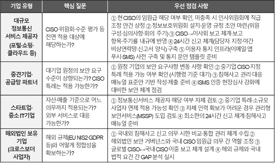 • 정보통신망법 제45조의3에 따라 현 CISO가 임원급(상법상 업무집행지시자·집행임원 포함)에 해당하는지 확인하고, 미충족 시 인사위원회에 직급 조정 안건을 시행일 전까지 상정할 것