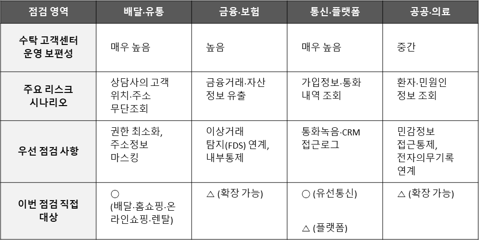 점검 대상은 고객센터 업무 수행 과정에서 고객의 주소 등 민감정보에 해당할 여지가 있는 위치·생활정보를 일상적으로 취급하는 5개 분야, 즉 ①배달, ②홈쇼핑, ③온라인쇼핑, ④렌탈, ⑤유선통신입니다. 이들 업종은 상담업무의 상당 부분을 외부 콜센터 업체에 위탁하는 구조가 일반적이며, 수탁사 직원이 실질적으로 고객정보에 접근하는 최전선 취급자라는 공통점이 있습니다.