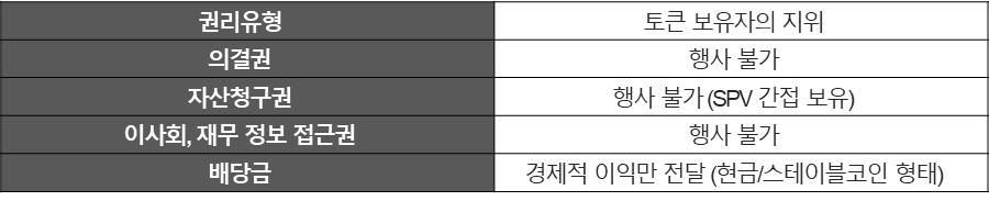 따라서, 향후 동일한 구조의 토큰 발행 시에는 (i) 투자 대상 토큰이 직접 소유(Direct Ownership) 방식인지, SPV를 통한 합성 노출(Synthetic Exposure) 방식인지 구분, (ii) 발행플랫폼의 파산 절연(Bankruptcy Remoteness) 구조 및 SPV 자산의 독립성 확보 여부 확인, (iii) 배당금, 의결권 등 주주 권리의 전달 방식 및 법적 근거에 대한 검토가 필요합니다.